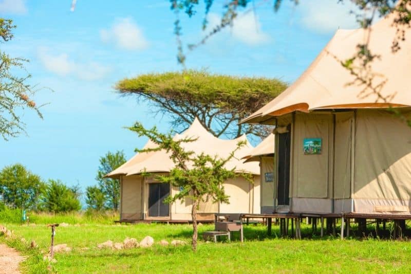 The Serengeti Wild Camp features 20 spacious, self-contained tents, offers a close-to-nature experience including hearing distant elephant trumpeting at night.