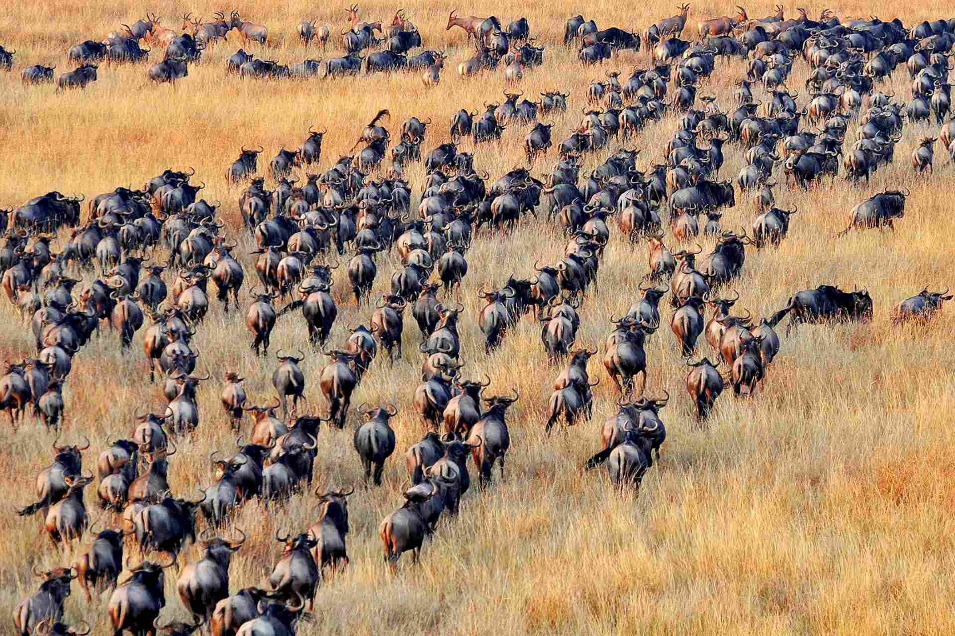 Every year, the wildebeest migrate in a circular form due to the seasonal rains. A unique survival instinct powers their migration: they follow the fresh grass pastures that sprout after the rains, ensuring their survival.